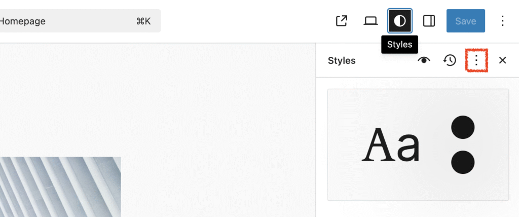 To add your custom CSS, head to Appearance > Editor > Pages > then, click into the Page in the viewing window. In right-hand Settings sidebar, click on Styles icon (the black and white circle icon). Click on three vertical dots and elect Additional CSS.